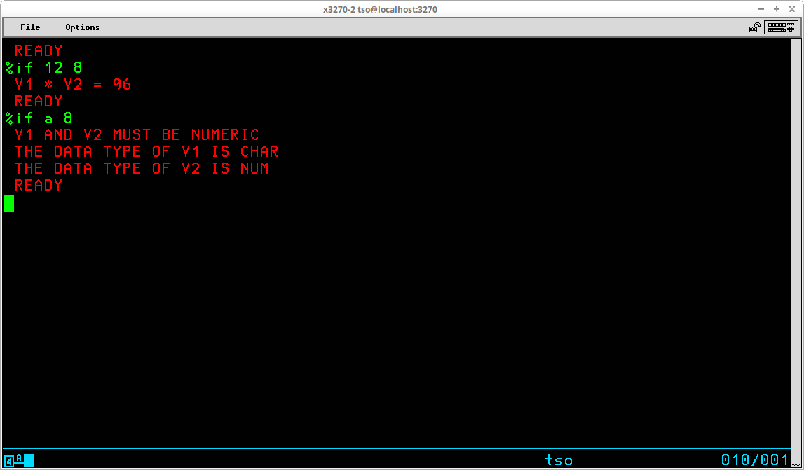 PROC 0 V1(0) V2(0) /* SECOND LEVEL CLIST: ADD */ IF &SYSNEST EQ NO THEN DO WRITE YOU CANNOT INVOKE THIS PROCEDURE DIRECTLY EXIT END WRITE &V1 + &V2 = &EVAL(&V1 + &V2) EXIT